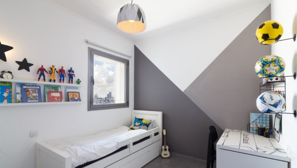 החדר של שני האחים, בני שש ושלוש, קיבל מתיחת פנים שהתחילה עם קיר המשולשים האפורים. מדובר בחדר די קטן והפתרון שהכי נוח להורים זה מיטת חבר נפתחת שבה האחים ישנים יחדיו. זה גם מה שאפשר להוסיף פינת למידה עבור הבן הגדול שעלה לכיתה א׳, כך שיוכל להכין שיעורי בית ולצפות בזום. סל אחסון לצעצועים ומתלים מדליקים לכדורים, עוזרים לשמור על הסדר.